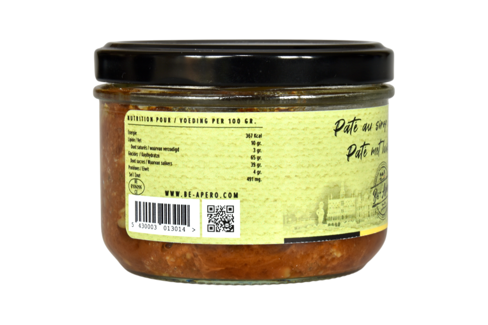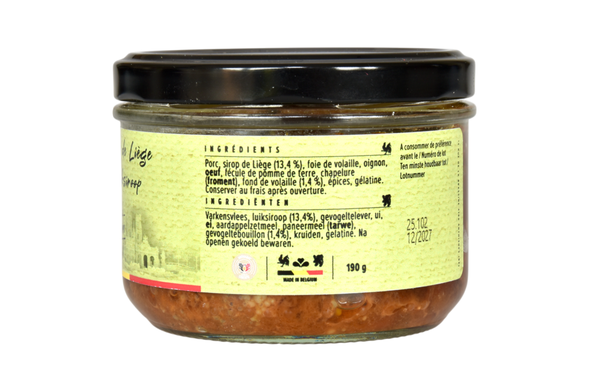 Ingrédients : Porc, sirop de Liège (13,4 %), foie de volaille, oignon, oeuf, fécule de pomme de terre, chapelure (froment), fond de volaille (1,4 %), épices, gélatine. Conserver au frais après ouverture.